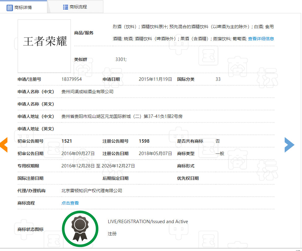 2015年11月19日,贵州问渠成裕酒业有限公司(下称问渠酒业)申请注册第18379954号“王者荣耀”商标(下称诉争商标),指定使用在第33类烈酒(饮料)、烧酒、酒精饮料(啤酒除外)、果酒(含酒精)等商品上,期间商标被提起异议,不过最终于2018年5月7日被核准注册。