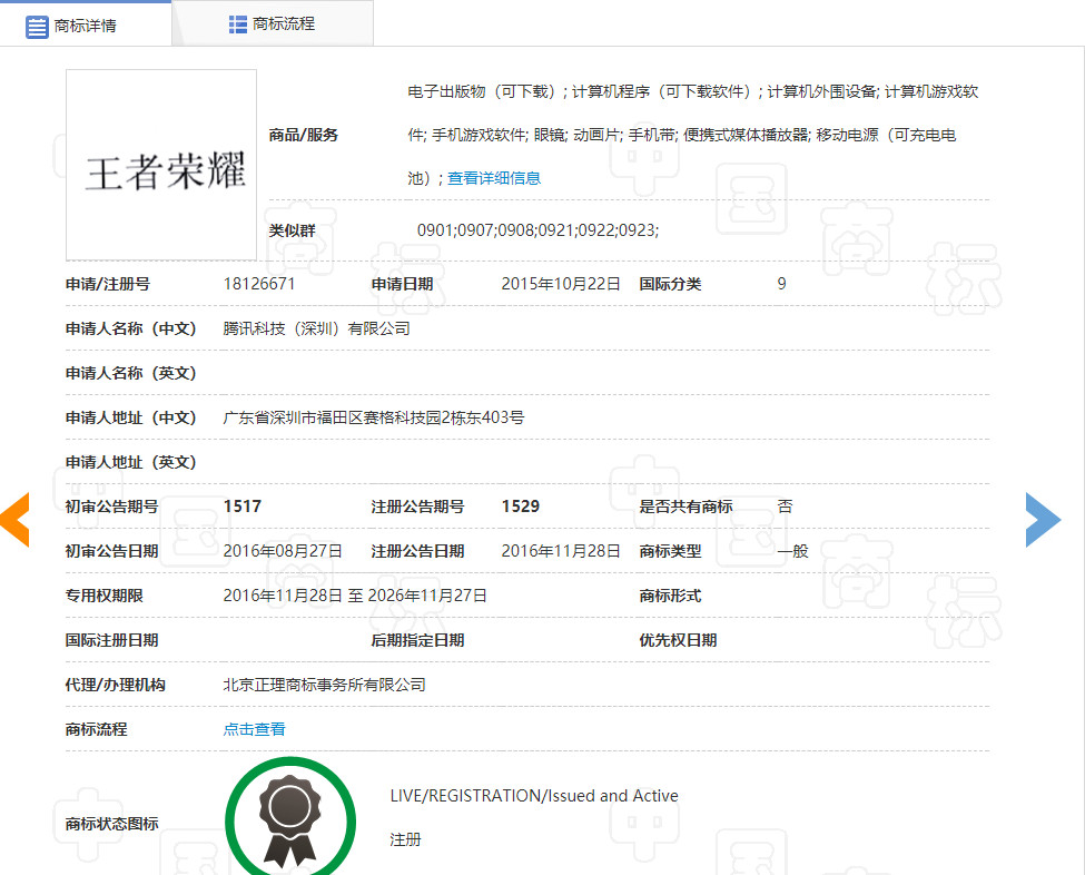 2018年6月19日,腾讯公司以侵犯其在先著作权为由,向原国家工商行政管理总局商标评审委员(下称原商评委)会对上述商标提出无效宣告请求,其认为诉争商标与腾讯公司的第18126671号“王者荣耀”商标(下称引证商标)构成使用在类似商品上的近似商标,易使公众误认,依据商标法第七条、第十条第一款第(七)项、第三十条、第三十二条以及第四十四条之规定,请求对诉争商标予以无效宣告。据查,引证商标于2015年10月22日申请注册,2016年11月28日被核准注册使用在电子出版物(可下载)、 计算机程序(可下载软件)、 计算机外围设备等第9类商品上。