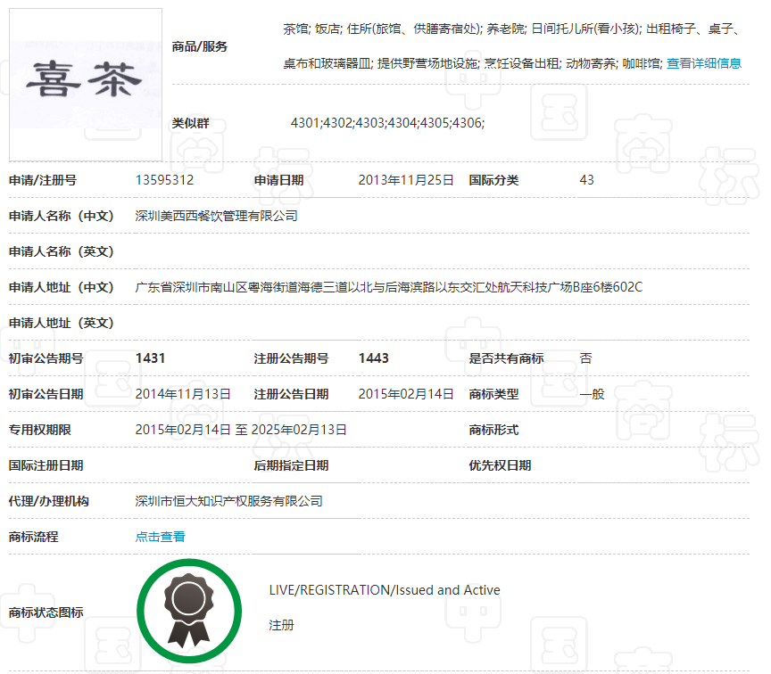 2018年5月11日,因认为诉争商标与其在先注册的第13595312号、第21265873号“喜茶”商标构成类似服务上的近似商标,诉争商标的注册损害了其字号权、著作权等,喜茶所属公司深圳美西西餐饮管理有限公司针对诉争商标提出无效宣告请求。